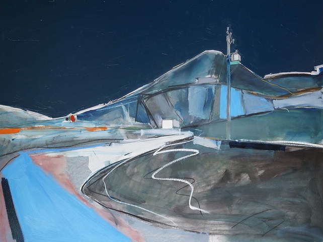 Cartman’s large scale painting Glenshee (Oil) sees the dynamic elements of his style pushed to their limit in an exciting combination of geometric abstraction and natural line. The sky is a progression of deepening tonality from left to right, intersected by white, rectangular impasto and the composition of blue, green, grey and white fields, with linear accents of orange and arched mountains, lead the eye to dwell convincingly at the centre of the composition. The sense of space and depth in the landscape is powerfully realised in the artist’s design, distinctive marks and distilled palette.