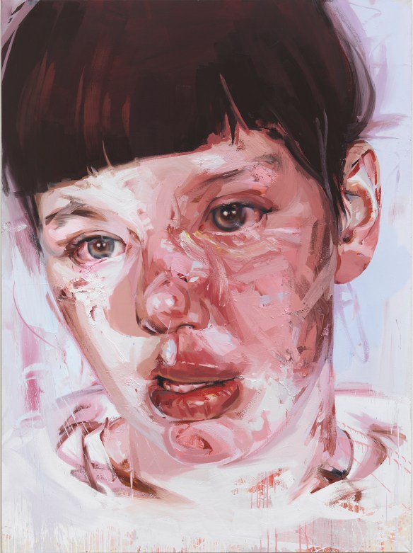 Witness (2009, Oil on canvas, 270 × 219.4 × 6.4 cm. The Museum of Fine Arts, Houston, USA) places a magnified young face, with the mouth exploded in a vertical position, so that the viewer becomes witness. Saville commented: “It was tough going to push beyond the surface horror into the paint.” Unlike a crime scene/ forensic photograph of documentation, the statement here is a document of the human mark in deep cadmium, alizarin and burnt umber, the stark, peachy pale skin magnifying vulnerability. Saville goes beyond gore into the nature of flesh made human. Even in this context, she fills the viewer with wonder in every mark, as bodies disappear and emerge in relative abstraction. Muse (2012 – 2014, Charcoal on canvas. Unframed: 212 x 170.4 x 3.2cm, Private collection) is a particularly beautiful example, where the deconstruction of form and idea reconstructs the self with force, passion and determination. You gain a sense of Saville’s artistic discipline, intense curiosity and driven process in this show and it’s awe inspiring! Crucially, unlike at lot of other YBAs, her approach to her subject transcends the marketable artist/ celebrity persona- her work is simply about bigger stuff in action and vision. She is resoundingly her own muse in a way that truly inspires.