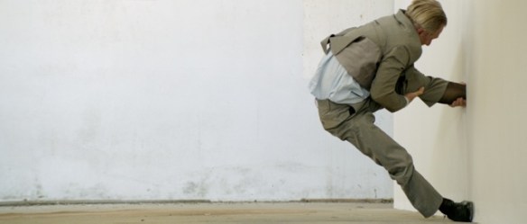 Austrian artist Markus Schinwald’s fascinating two screen video work Orient (2011, Looped, two channel HD video 09:00 min. each, colour, sound) reminded me of Pina Bausch’s choreography with its everyday immediacy, potently considered gestures and emotional punch. It is the first time that this work, originally created for the Austrian Pavillion at the 2011 Venice Biennale, has been shown in Scotland. Set in the monumental ruins of an industrial space, the doubled intersection of images, movement and bodily gestures, together with two different voiceovers create a free associative experience for the viewer/ participant. The relationships between a group of well-dressed men and women, moving in unison, individually or paired in observance of each other are, completely compelling as performance, accented with slapstick humour and irony. There are also moments of pure poetry written with the body; tap dancing feet in a sea of colourful, discarded circuitry wires, a man awkwardly scaling a door of opaque glass with a young woman walking straight through it a subversive moment later or a man with his leg caught between two giant structures of concrete trying to wrestle himself free. How we orient ourselves in time, space and in relation to each other is part of the eternal loop and I loved the way that each time I watched Schinwald’s split screens, new combinations of sound and image stimulated different streams of association. The way the artist splits and reassembles the collective psychology of being human provoked my curiosity and I was thoroughly taken by the mindful calculation and seeming randomness of this work.