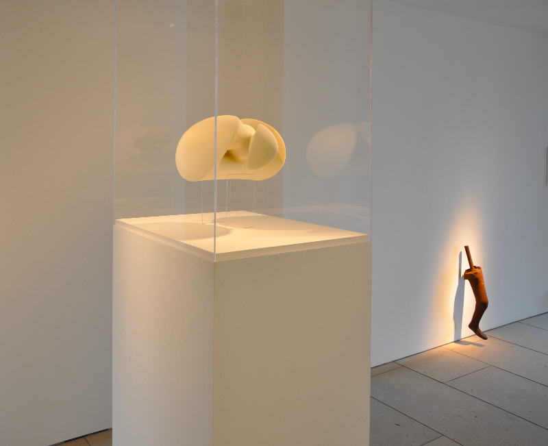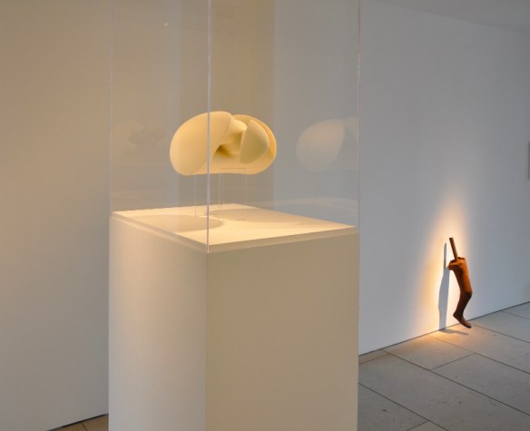 Christine Borland’s Positive Pattern (2016. Foam, Perspex, MDF, paint. No2 edition of 3), five abstract objects modelled on the spaces within Barabara Hepworth sculptures were created using 3D scanning and CNC router technology. The intriguing combination of Science and Art, originally commissioned by the Institute of Transplantation, Newcastle to honour organ donors and their families, is aligned with the viewer’s own body and internal organs according to plinth height. Because I have a reviewing policy of not reading any explanatory labelling/ text before looking at visual work, what struck me initially was the ambiguity of material. Housed in Perspex boxes it had the solidity of carved limestone, but the texture was too fine, implying a more delicate substance. The forms themselves were beautiful, hovering in an imaginative space between the organic and human-made, like macquettes in a stage of becoming. The presentation and grouping of objects felt clinical, collectively poised, flowing in energy yet isolated at various levels and confined in their cases.