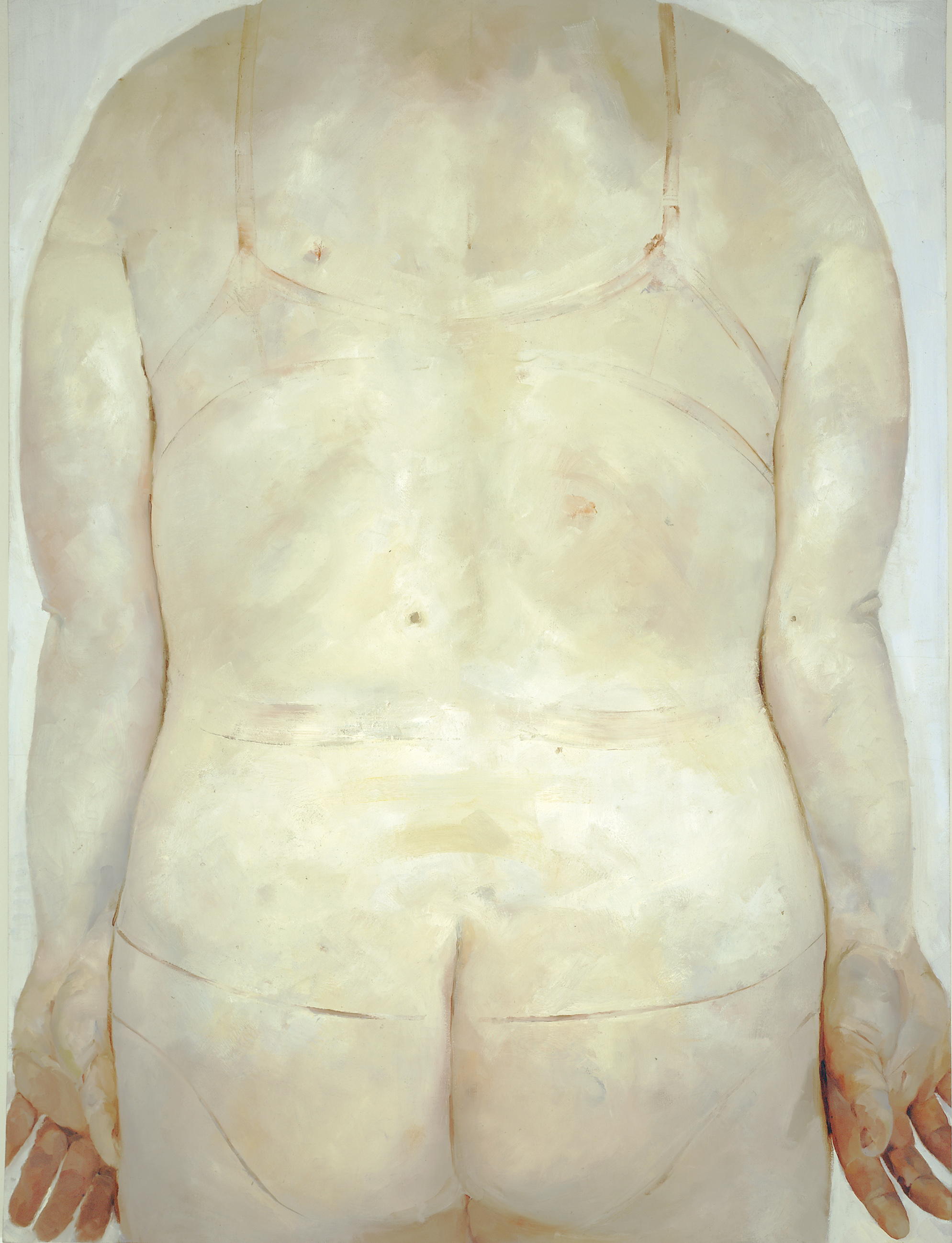 Wedged between the painting and mirrored confrontation, the immense physicality of this disappearance becomes present in the room as idea and experience, written on one’s own body in everyday life. It is only in looking by default at ourselves that the words become visible. Behind this mirror, at the entrance to this first room, is Trace (1993 – 1994, Oil on canvas, 213.4 x 182.9 cm. Collection of Larry Gagosian), a sobering acknowledgement from neck to buttocks, viewed from behind. Although the palms are flat they feel psychologically twisted, facing the viewer like those of a prisoner in a lineup. The exposure of pale skin, nuanced with greys, ochre, blue, umber and crimson, is painfully incised with the marks of underwear, imprinted on the skin. The cool, serene flesh-toned palette fills the canvas and the mind like a question. We’re faced with where we stand in this branding, then we step behind the painting to the Propped mirror and see. The way the exhibition is hung, cleverly places the viewer in direct relation to the work in this room. The space between Propped and the self-reflexive surface of the mirror is relatively neat, so you can’t stand back to distance yourself from either. Initially the human figure, expression and attitude, led by Saville’s paint handling draws you in, then you turn a perceptive corner and come face to face with the mirror, your own body and yourself. It’s a powerful mechanism of interrogation that perceptively creeps up on you before you know it, like all great art should.