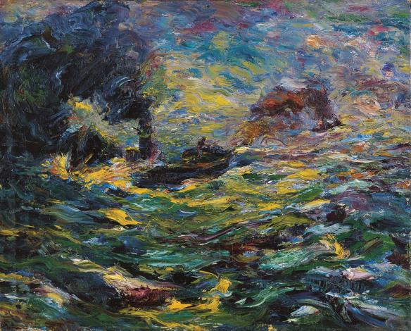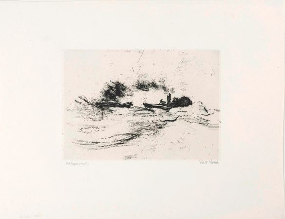 It is fascinating to witness the transformation of light and colour from Nolde’s Canal (Copenhagen) (1902, Oil on sackcloth) onwards and see the evolution of his mark. The way that bold, beautifully observed human marks in the artist’s ink and wash drawings translate into colour is one of the highlights of the show. Tugboat (1910 Brush, ink and wash on paper) and Smoking Steamboats (1910 Oil on sackcloth) are particularly fine examples. The impact of smoke and heavy industry on the environment isn’t lost on the artist. Nature is rendered with energetic brushwork in yellow, green, blue and deep purple, fighting back to engulf the human presence on an eternally vital sea.
