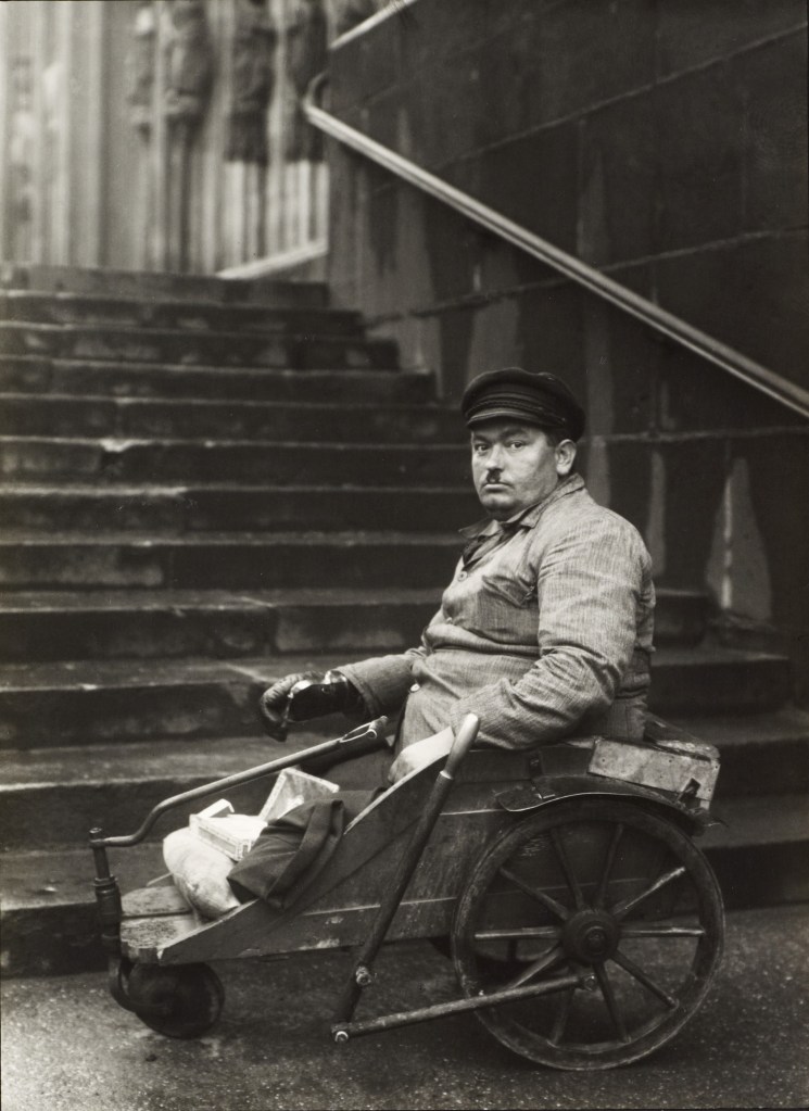 The effect of seeing this exhibition may be jolting, shocking and highly confrontational to some viewers, especially in relation to the savagery of Dix’s work, but grinding poverty, dispossession and the depravity of war exist all over the world today and that should shock everyone.   Sander’s epic photographic project People of the 20th Century, which began in 1910 and was still unfinished when he died in 1964, endures as a creative act of responsibility, reconnaissance and remembrance. The exhibition presents 144 photographs from the series, mixing the various categories and portfolios: The Farmer, The Skilled Tradesman, The Woman, Classes and Professions, The Artists, The City and The Last People. Sander sought to create “a social atlas of Germany”. His categorisations responded to the descent into fascism with the addition of The Persecuted and Political Prisoners portfolios, the latter made by his son Erich Sander in prison before his death in 1944. Significantly August Sander doesn’t preach or denounce, but allows the character and dignity of each sitter to speak for itself. These aren’t portraits taken for aesthetic reasons or commission, but with the objectivity demanded by the political, social, cultural conditions and constraints of the time. Sander’s lens, like his mind  and heart, were egalitarian by nature. He was leftist, antifascist, aligned with the Cologne Progressives and worker’s movement, politics that made him a target for the National Socialist party. In 1936 stocks of his first book Face of our Time (German: Antlitz der Zeit), published in 1929, were confiscated by the Nazis and the photographic plates destroyed. His work was considered “un German “by the Third Reich in its essential connectivity. What speaks to the viewer across time are the faces of individuals and the humanity at the heart of Sander’s life- long project. Photographing German society according to hierarchical occupations and class was entirely in keeping with his worldview. To contemporary eyes, categorising human beings may seem extremely clinical and ironic given the systematic application of that methodology to the Holocaust. We may also perceive categories such as The Last People; idiots, the sick, the insane, and the dying or The City; Travelling People, Gypsies and Transients as dispassionate and potentially inflammatory, however Sander’s intent was inclusion, highlighting marginalisation in German society.