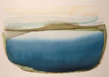 Edginess and emotional height is realised in a very different way in Peter Davis’s Edge of the Storm (Watercolour and pigment on paper, 50 x 70cm) in the tonality of forces; dark and light, pitted against each other in the still calm before the storm. This is beautifully realised in the bisected composition and expert handling of a fluid and notoriously unforgiving medium. What is captured very potently is the threat of the storm, the tension in the moment before the onslaught; that very particular angry blue/grey temper of Scottish skies which is part of the internalised character of Northern land and seascape. The way the pigment is suspended, preserved in its once liquefied medium, also conveys the anticipatory moment, that heaviness, which contrasts beautifully with a shining horizon line of light over the sea. A zen like economy of expression also infuses the ink wash of Mary Bourne’s Cloud Mass over the Sea, a wonderful dance between form, fluidity and reflection. In Red Cloud over Sea (Ink wash on paper) Bourne combines strong marks bled into the edges in a marriage of accidental and controlled marks, capturing one of Nature’s meditative moments. Her low relief sandstone and palladium leaf sculptures; Beach I, II, III (each 30 x 30 cm )present not just an effective abstracted play of light on the sand in three dimensions, but the understated simplicity, of leaving the door ajar for the viewer’s own imaginative experience of the shoreline; triggering memories of walking on sand among glinting pools and the dancing light of the sun.