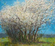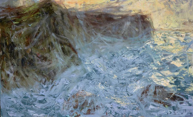 A master of light and landscape painting in the Northern Romantic tradition, Allan MacDonald’s Great North Headland (Oil on canvas, 40 x 152 cm) is a triptych which celebrates divinity in nature, conjoined with a human heart and mind beholding it. The massed energy of turbulent seas are realised in an invigorating palette of ochre, orange, red, green, umber and white- the physicality of cold salt spray and the heat of sublime spirit animating it, seen as underpainting or ground emerging through the layered impasto. A progressively more abstract immersion Form and Void- Beauly Firth (Oil on board) is bolder and confidently intuitive, with large flat foreground brush marks, white ground shining through and a blaze of resiliently hopeful blue. The paint handling reveals the artist’s direct response to the enormity of Nature; land, sea and sky, which comes from working outside in all weathers. In Malestrom Eshness (Oil on board) a fury of waves crashes against the coastal cliffs- raw power, green, white, umber and furious grey, like the livid eye of stillness at the centre of a raging storm. These works aren’t seascape scenes, but richly interpretative paintings, demonstrating a commitment to craft and belief with the artist’s brush marks testimony to that all-encompassing devotional energy. They are also very physical responses to an endlessly challenging environment. The artist doesn’t distance himself from the life force of nature all around him but actively goes out to meet it with all his perceptive faculties, not just what can be seen with his eyes. In consequence the viewer feels as if they too are standing on the edge of the cliff; in the grip of an essential dynamic between humankind, Nature and the eternal mystery of the sea.