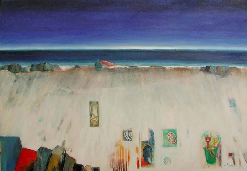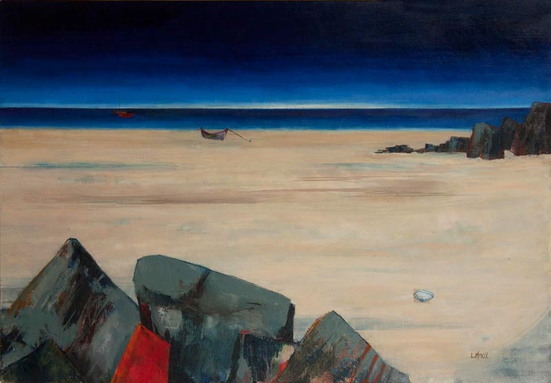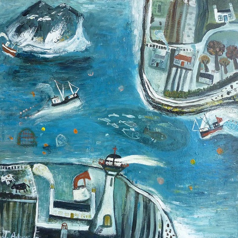 James Newton Adams has contributed a series of strong compositions to the exhibition including As I was Going to St Ives (Acrylic on canvas, 86 x 96 cm) and In the Company of Birds, (Acrylic on canvas, 87 x 87 cm), injected with Newton Adams’ characteristically whimsical streak and naïve style, tempering what is a harsh human existence carved out between land and sea. One of the most interesting and affecting works in that respect is A Pocket Full of Fish (Acrylic on canvas, 97 x 97 cm) Newton Adams doesn’t often depict the female figure but here his expressionistic rendering of a pregnant woman with a baby standing beside the absence of her partner, his orange fishing overalls suspended from the clothes line, is an insightful and socially charged image of inevitability and unrealised hopes. The pocketful of fish in her partner’s overalls feels like a consolation prize, rather like the bundled child tucked nondescriptly in her arm like a lifeless, sleeping doll. The mother’s bleak expression, mouth pinched shut like the red peg in her hand and with a hint of shadowed bruising around her eye, expands the in the pervasive mood of the composition. In the background a male figure plods, head bowed, along a depressively level horizon of road. Characteristic use of strong primaries; red, blue, yellow , together with the monochrome weight of white and black which delineates figurative scenes of coastal village and domestic life, give Newton Adams’ paintings a certain edginess and emotional height uniquely his own.