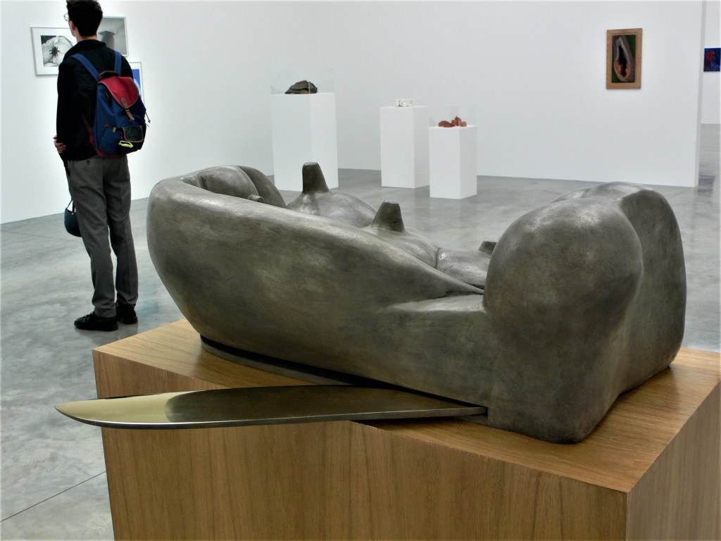 There is also more than meets the eye in Breasts and Blade (1991, bronze, silver nitrate and polished patina, 11 x 32 x 16 in.) by Louise Bourgeois. What we see from the front is a sculpture composed of folds of flesh and five breasts like cushions with the pronounced geometry and provocation of protruding nipples.  As you move to the side and back of the structure the overall form comes into view. The associations of comfort and domesticity in an everyday piece of furniture and the couch as a repository of the traditional female nude in art comes into play. Then you come to the switchblade behind, the threat of violence where you’d least expect it, a warning against stereotypes and reductive visions of femininity, maternity and eroticism. The artist’s sculpture is like a surreal beast not in an aesthetic but a revolutionary sense. It defies and changes your perception as you move around and find yourself in relation to it. It’s a tangible presence that nourishes, intrigues, seduces, challenges and menaces the viewer from the plinth. It isn’t fantastical but potently real, infinitely more complex than simple dualism or juxtaposition of opposing elements. The inference of soft comfort is rendered in the solidity of polished metal, the couch accommodating the whole family and its needs, equally a source of feminine disquiet. It lives and grows in the imagination as you experience it resoundingly in three (or more) dimensions, as one would expect from a Master of her own Art. The femininity here has multiple layers, views, identities and hidden capabilities against type- it’s a work which refuses to be boxed, with its own distinct voice. I never cease to be amazed, elated and inspired by the penetrating honesty of this artist’s work. Bourgeois brings much that is held beneath the surface into the light with immense courage, consummate skill, tenacity and feeling.